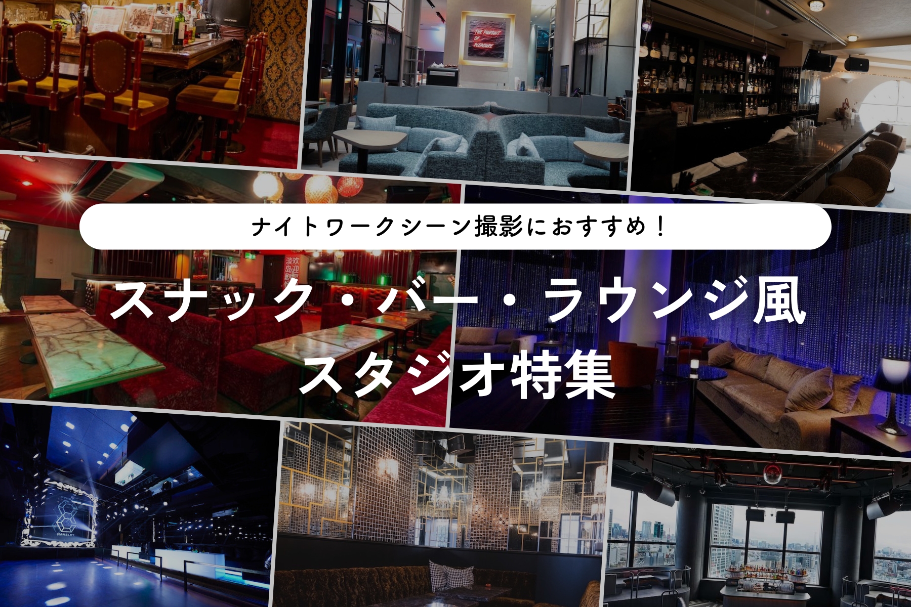 ナイトクラブ風の撮影スタジオ。豊富な背景で様々なシーンの撮影が可能。家具が高級感のある雰囲気を演出。ピアノやDJブースもあり、楽器演奏も可能。