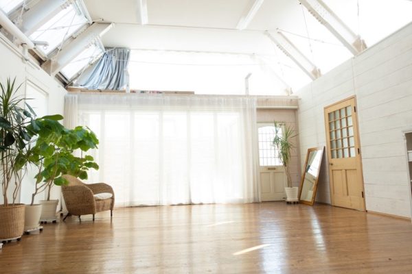 谷中銀座商店街にある隠れ家風のスタジオ。自然光が入る窓は調光可。最大天井高5.5m、フローリング床、コンクリート壁を背景に様々な撮影・収録が可能。