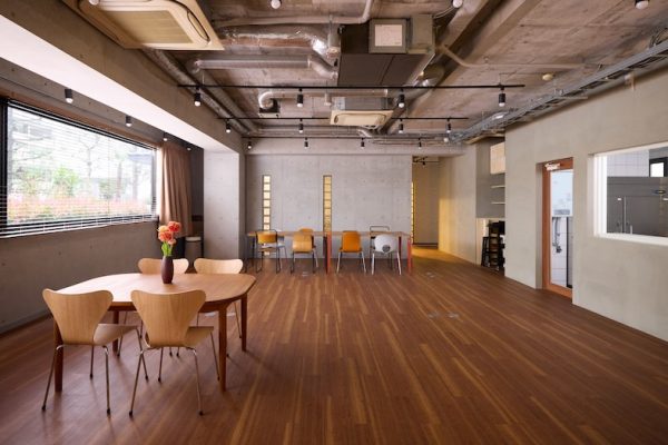 162㎡天高4mの自然光が差込むメゾネット仕様。1階のカフェエリア/2階の白壁とフローリングエリア/吹き抜けの階段で構成された空間。控室も4部屋あり。