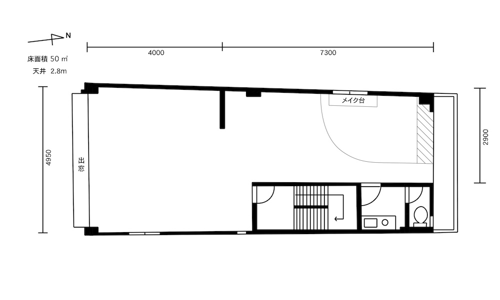 コンクリート壁・白壁・コンクリート床を基調とし、明るく儚げな雰囲気の空間。壁のコンクリートは経年変化で剥がれたような模様で、味のある雰囲気を演出します。
