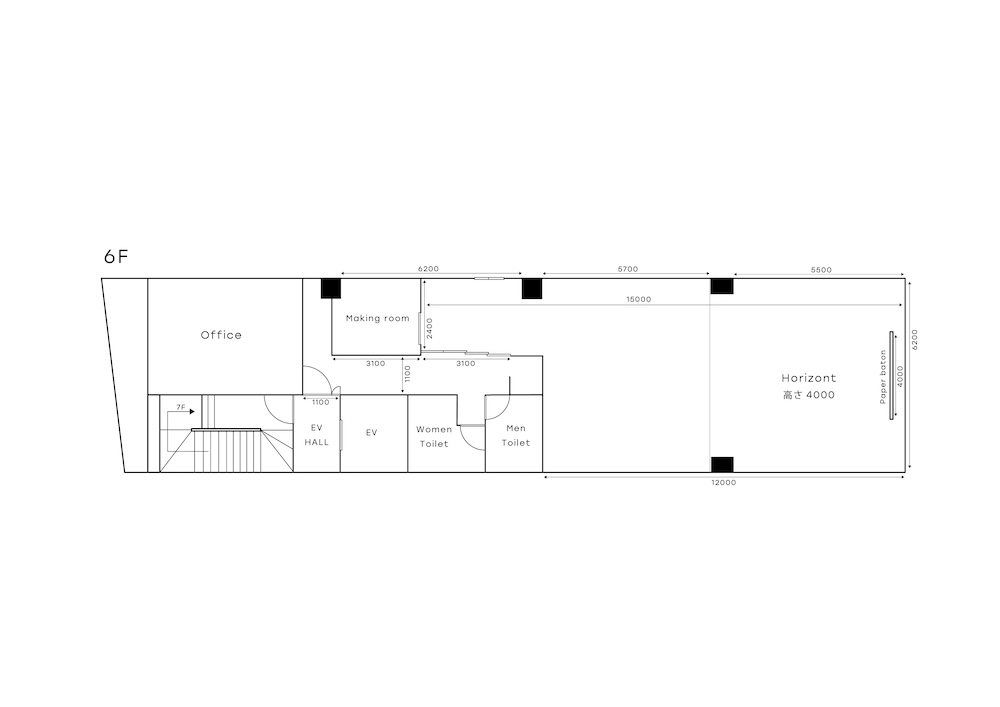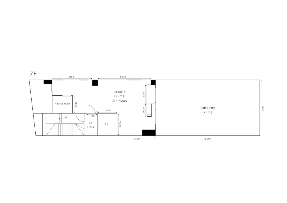 引き12m、自然光が入る南向きのスタジオ。可動式の円柱が3本有。白の2人掛け/1人掛けソファも有。テーブルも多数常設。70平米のベランダは最上階で、周りのビルが気にならないため、抜けの良さも魅力です。