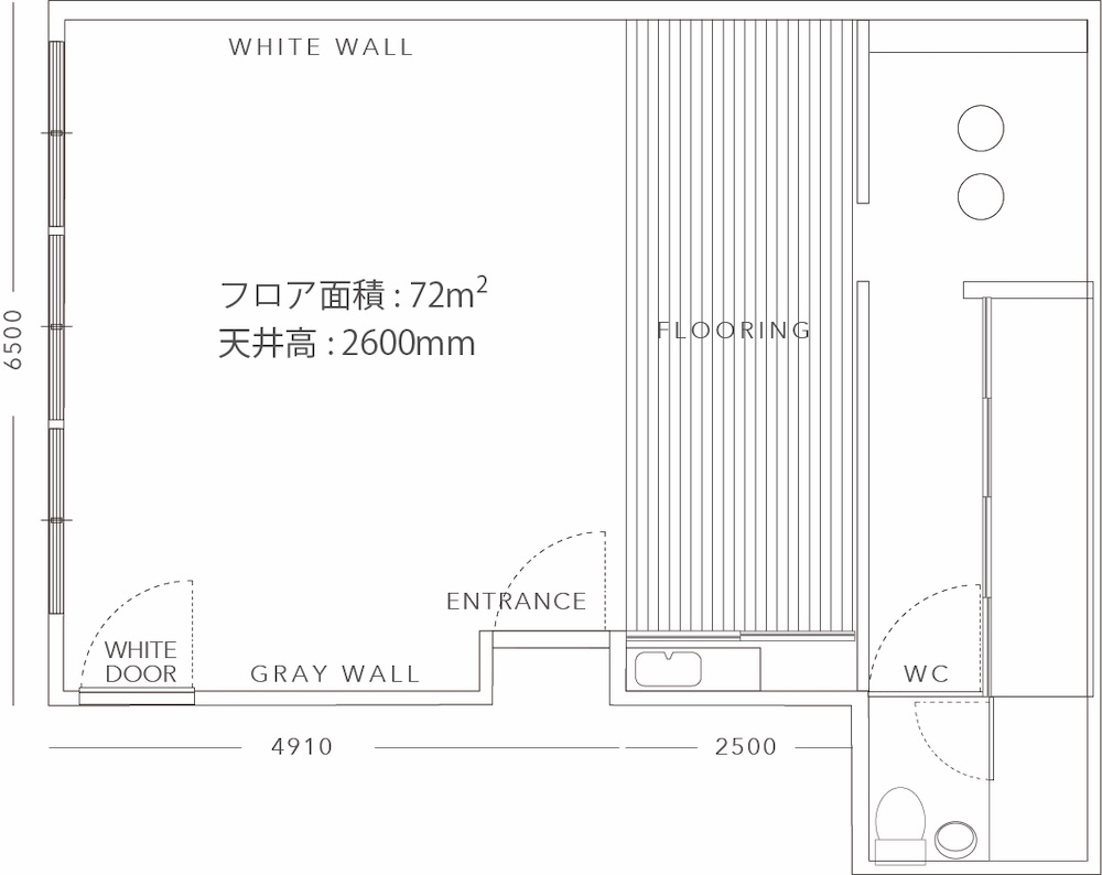 室内は、白壁やグレー壁とコンクリート床のメインスペース、温もりのあるフローリングスペースが展開。