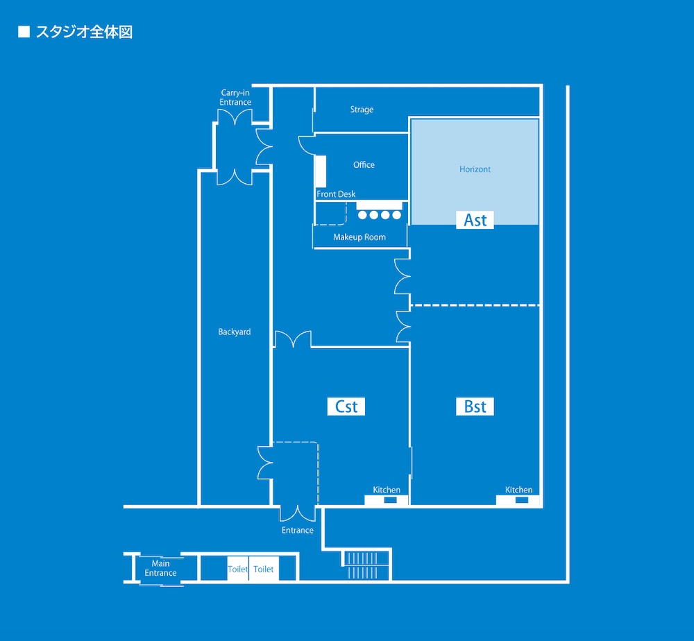 スタジオはAst〜Cstの3面をご用意。どのスタジオにもストロボ6台6灯を常設。商業レベルのライティングも即座に対応可能です。特に、Astには白ホリゾントを備え、メイクルームを併設。モデルやタレントの準備にも最適です。