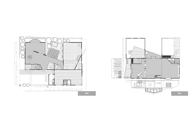 2Fは中央に大きな5m 高のスカイライトを持つ自然光の降り注ぐグラスハウス空間にグレイッシュでナチュラルな空間。可動式のアイランドキッチンや暖炉が、特徴的なポイント。