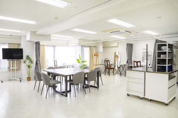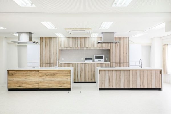 一棟に複数スタジオを展開しているビル1階、ナチュラルな印象のキッチンスタジオ。3口のガス口のある幅3mの広々としたアイランドキッチンが特徴。