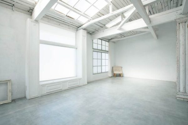 マルチな大型撮影スタジオ。白いンクリートを基調としたシンプルな空間で、自由に空間をレイアウト可能。大きな窓から自然光が豊富に入ります。車両の乗入れも可
